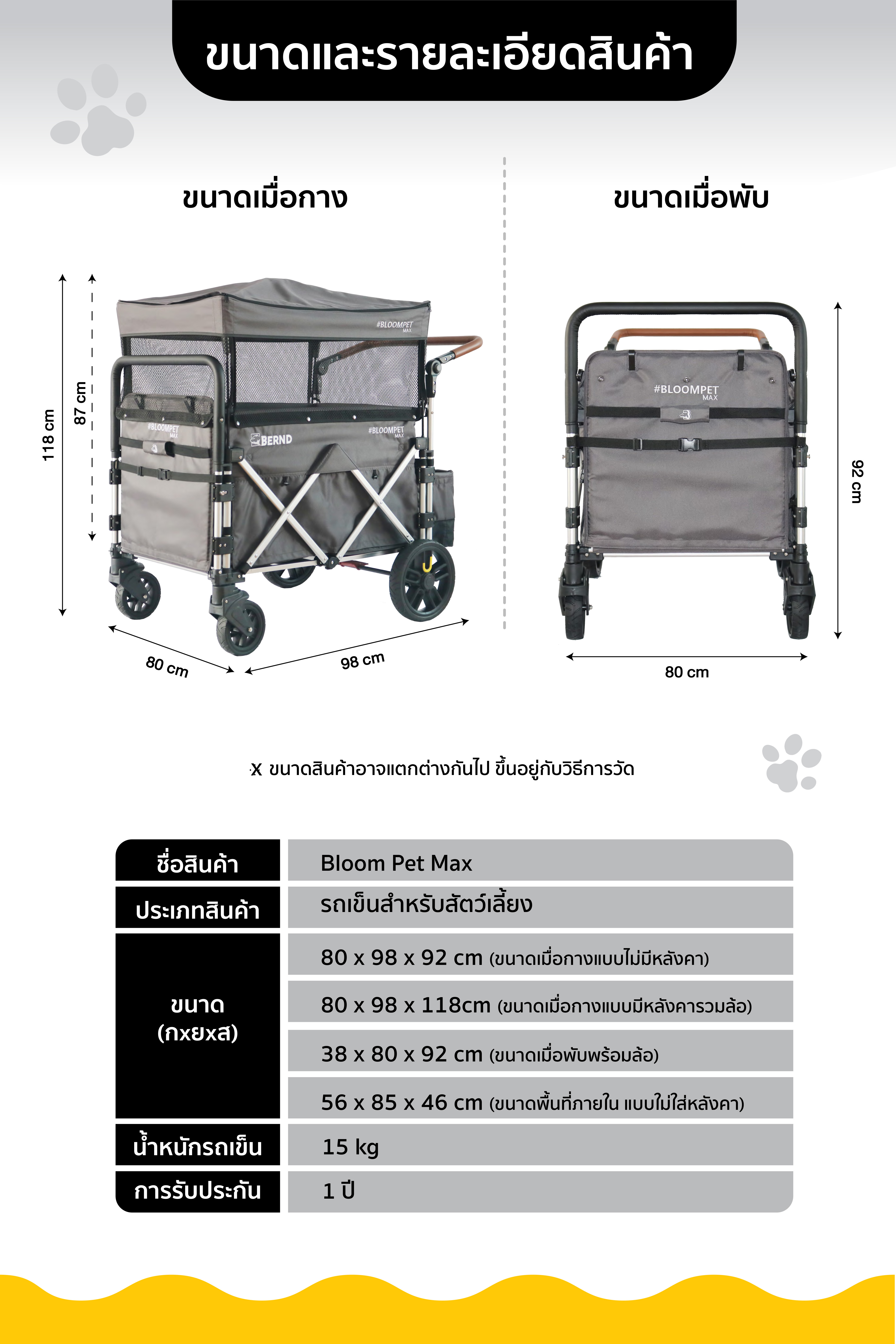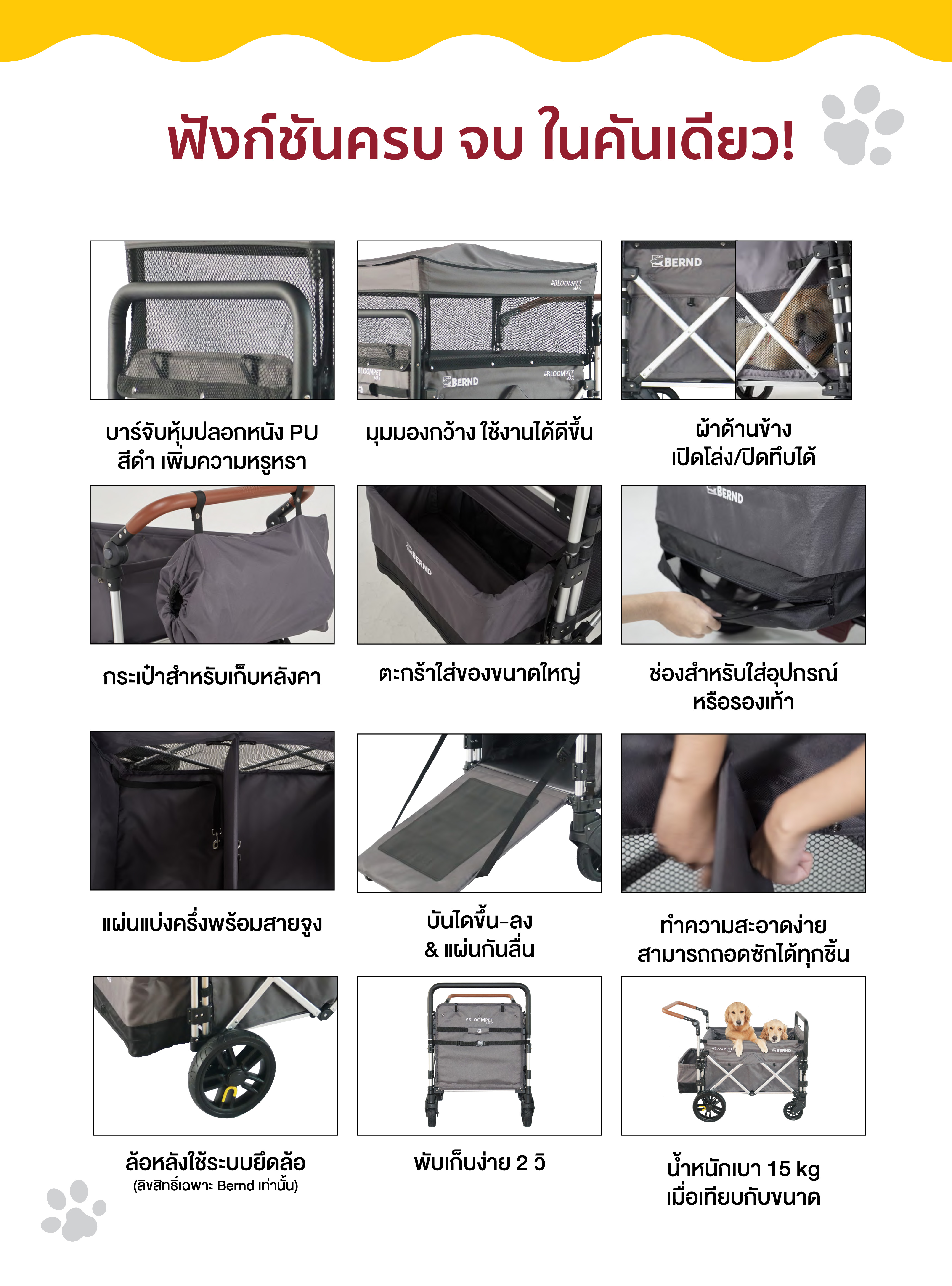 - น้ำหนักรถเข็นเพียง 15 กิโลกรัม เบากว่าที่คิด เคลื่อนย้ายง่าย- บันไดขึ้น-ลงพร้อมแถบกันลื่น รองรับน้ำหนักได้ถึง 60 กิโลกรัม สะดวกและปลอดภัย- โครงสร้าง FRP (Fiberglass Reinforced Plastic) แข็งแรง ทนต่อการกัดกร่อน ระดับวัสดุที่ใช้กับอากาศยาน- ระบบล้อเฉพาะ Bernd ยาง 500D หนาแน่น ล้อใหญ่ มั่นคง พร้อมเดินทางได้ทุกที่- ดีไซน์หรูหราด้วยด้ามจับหุ้มหนัง PU สีดำ จับถนัดมือ เพิ่มความพรีเมียม- ช่องมองและผ้าตาข่ายระบายอากาศ เปิดโล่ง/ปิดทึบได้ตามต้องการ- ถอดซักง่ายทุกชิ้นส่วน ดูแลรักษาได้สะดวก
