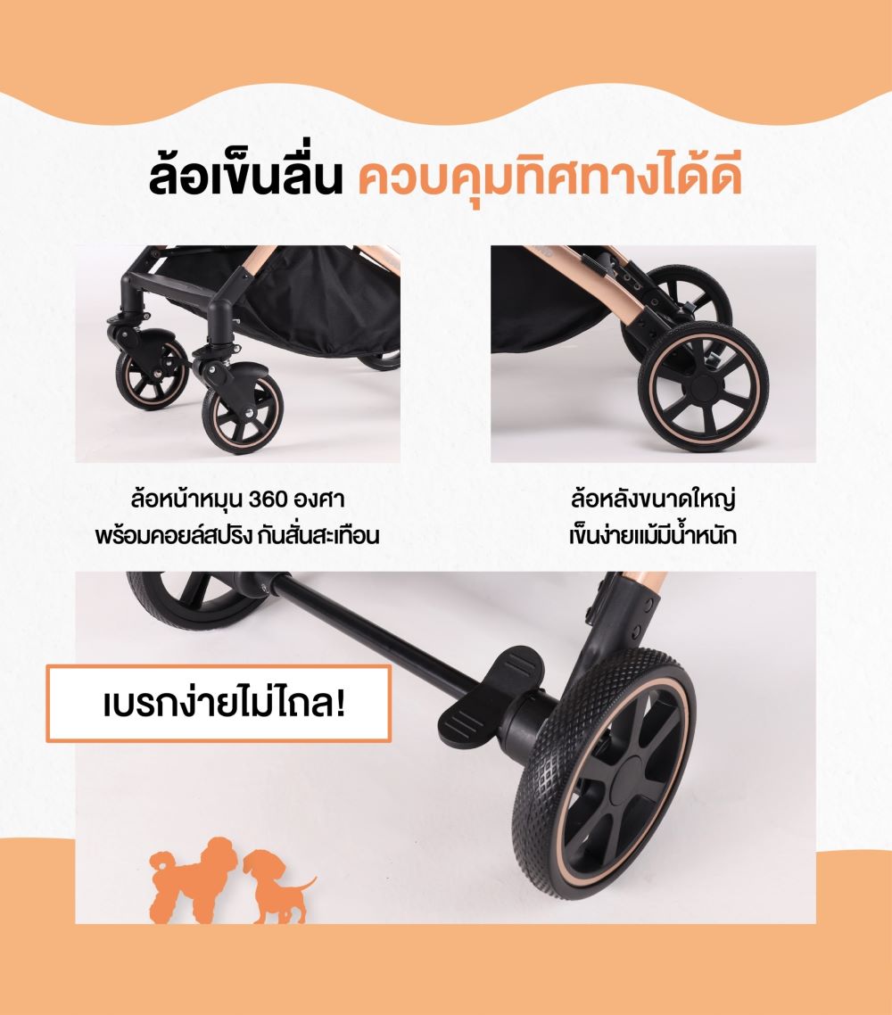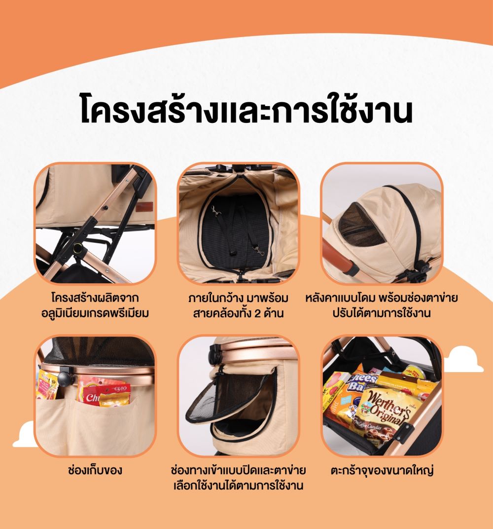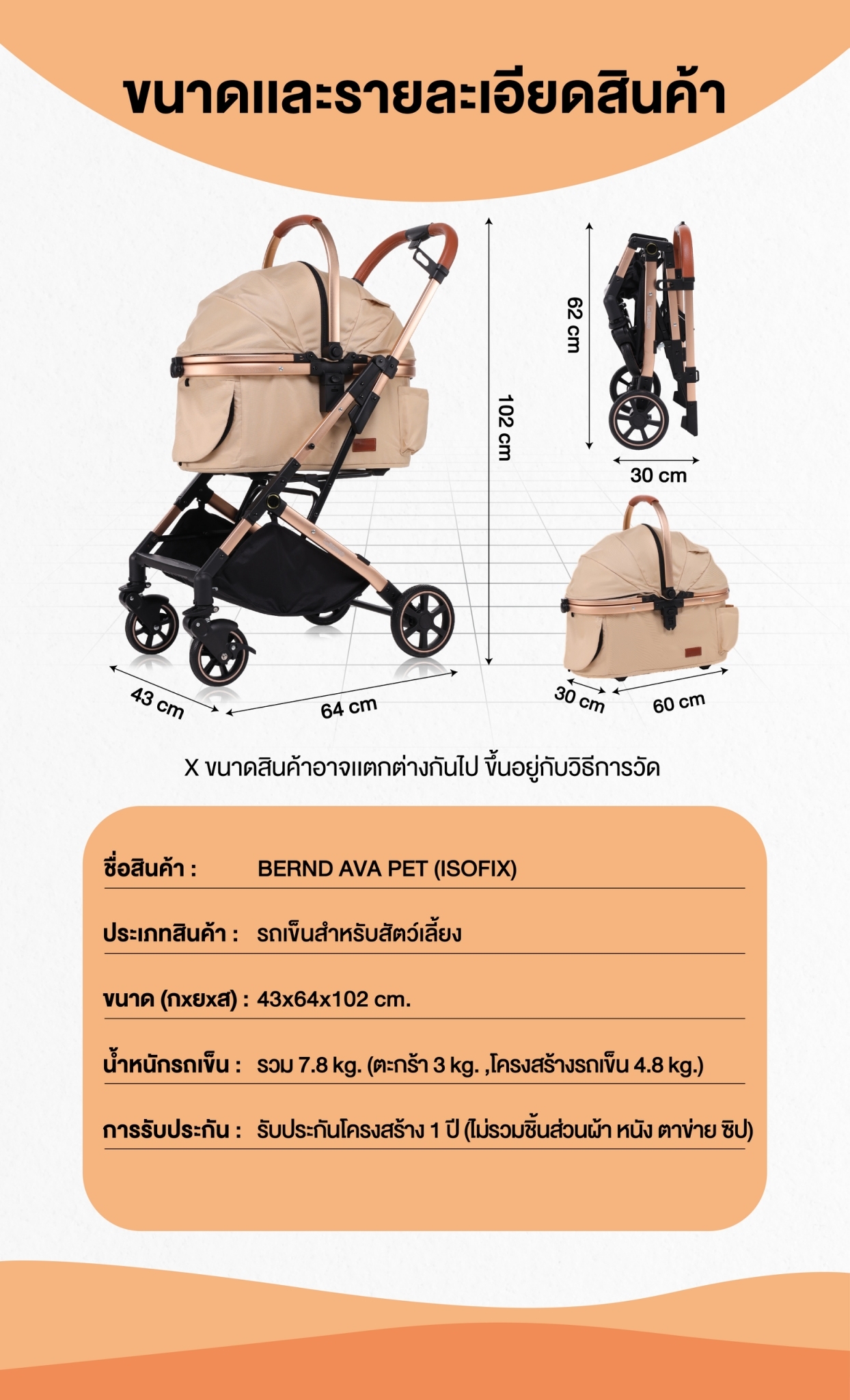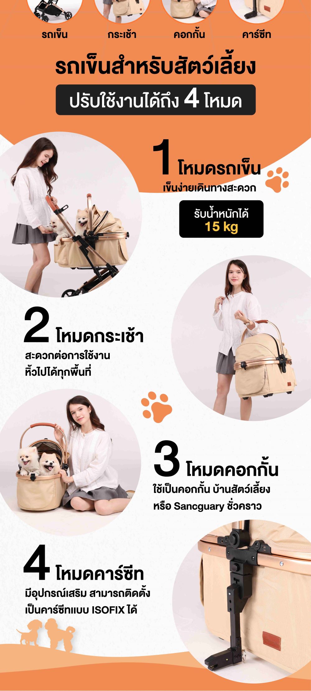 - มี 4 โหมดการใช้งาน ไม่ว่าจะเป็น โหมดรถเข็น , โหมดกระเช้า , โหมดคอกกั้น , โหมดคาร์ซีท- รุ่นนี้เหมาะสำหรับสัตว์เลี้ยงขนาดเล็กโดยเฉพาะเเมว เพราะตะกร้าออกเเบบให้สามารถปิดได้มิดชิดรอบด้าน มีความเป็นส่วนตัวสูง- ด้านในมีสายล็อคปลอกคอสัตว์เลี้ยง 2 สาย- โครงอลูมิเนียมเกรดพรีเมี่ยมที่มีความแข็งแรงพิเศษ ผลิตจาก Aluminum เกรดพรีเมี่ยม ทำให้มีน้ำหนักเบาแต่แข็งแรงมาก- ตะกร้าสามารถเป็นคาร์ซีทในรถ มีอุปกรณ์ Adapter Isofix แถมให้ฟรี ช่วยให้การติดตั้ง ISOFIX เพื่อความปลอดภัยและติดตั้งในรถยนต์ได้อย่างง่ายดาย- สามารถถอดตะกร้าออกได้ เพียงกดปุ่มทั้ง 2 ข้างพร้อมกัน ง่ายและสะดวก- หลังคาและตะกร้ามีช่องตาข่ายสามารถมองออกได้ทั้ง 2 ด้าน ด้านหน้าและด้านหลัง- ตัวหลังคา สามารถเปิดกว้างออกได้ทั้ง 2 ด้าน หรือสามารถเปิดตรงกลางได้- มีตัวล็อกสำหรับปิดหลังคาตะกร้าทั้ง 2 ด้าน- ล้อขนาดใหญ่ ทำให้ควบคุมทิศทางและรองรับแรงกระแทกได้ดีเยี่ยม- ล้อยาง อัพเกรดเป็นพรีเมี่ยม EVA ให้ความทนทาน ไม่ลื่น เข็นได้อย่างนุ่มนวล- น้ำหนักรถเข็นรวมตะกร้า 7.8 kg.- น้ำหนักโครงรถ (ไม่รวมตะกร้า) 4.8 kg.- ขนาดคาร์ซีท (กxย) 30x60 cm.- ขนาด (กxยxส) ตอนกาง 43x64x102 cm- ขนาด (กxส) ตอนพับ (มีล้อ) 30x62 cm.- แถมฟรี ที่วางแก้ว รับประกันโครงสร้าง 1 ปี (ไม่รวมชิ้นส่วนเนื้อผ้า ตาข่าย หนังและซิป)